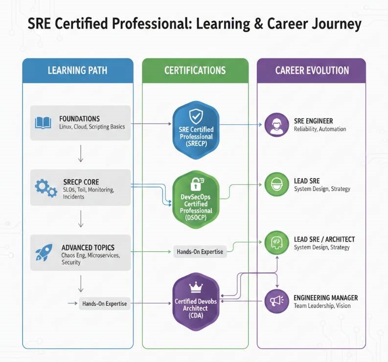 The SRE Certified Professional (SRECP) is a specialized program that validates your expertise in building and maintaining reliable, scalable, and efficient software systems. It is rooted in the principles popularized by Google, focusing on mathematical and engineering approaches to uptime rather than just “hope.”